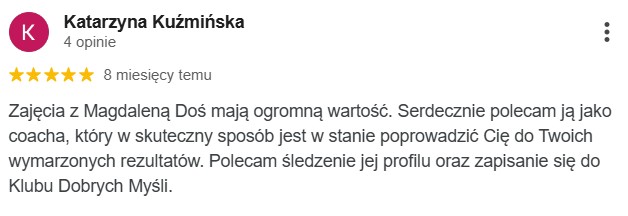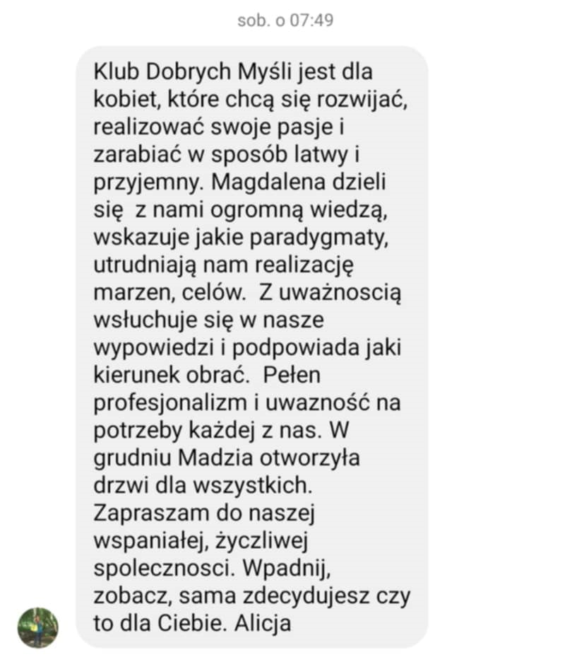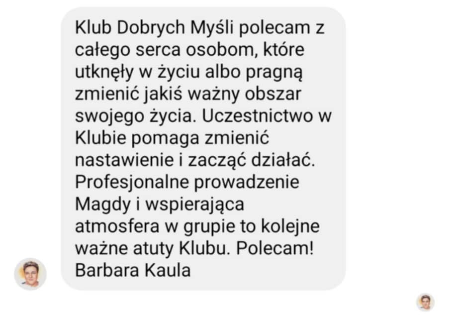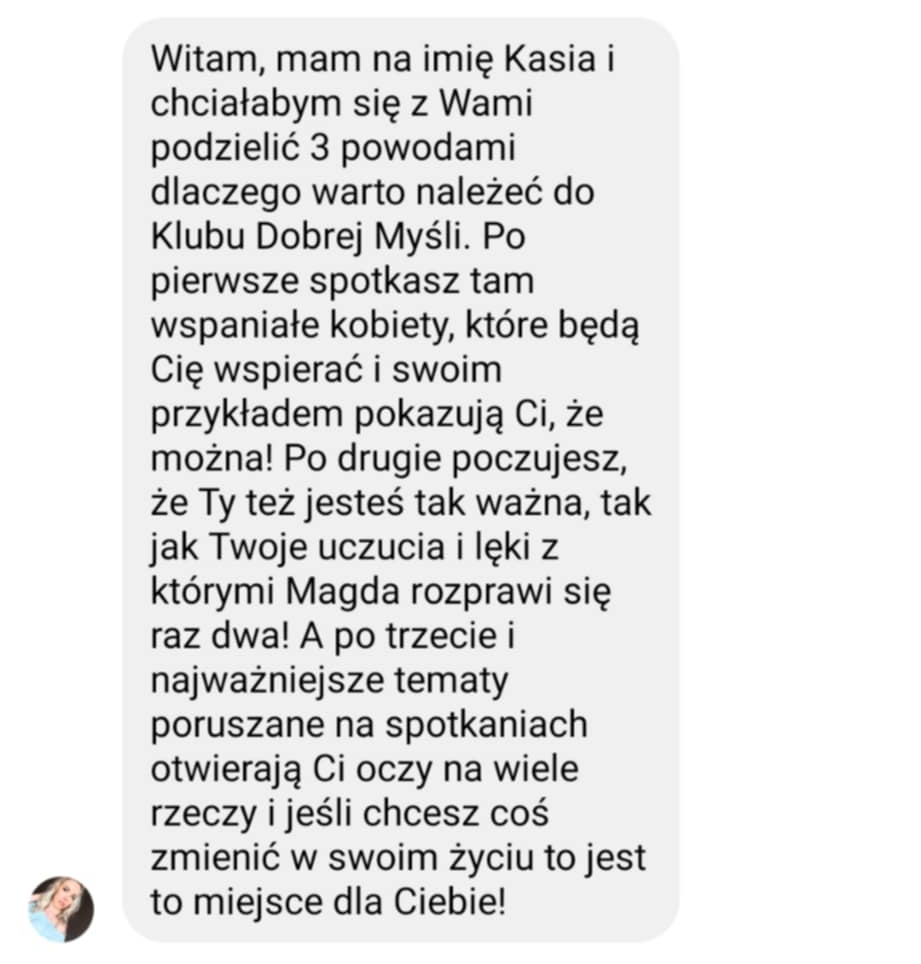 Właśnie dla osób takich jak Ty stworzyłam Klub Dobrych Myśli, czyli miejsce, gdzie dzielę się wartościowymi treściami związanymi z rozwojem osobistym, popycham i motywuję do działania, odpowiadam na pytania dotyczące Twojej zmiany mentalnej oraz gdzie w otoczeniu pozytywnych, otwartych ludzi wzajemnie się wspieramy w naszych krokach do celu.
